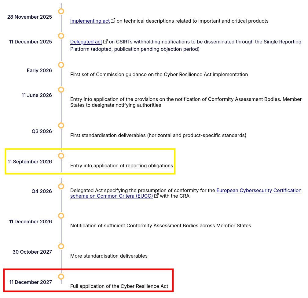 Reporting obligations laid down in Article 14 apply from 11 September 2026. As of that date, manufacturers are required to notify actively exploited vulnerabilities and severe incidents having an impact on the security of their products with digital elements via the single reporting platform.